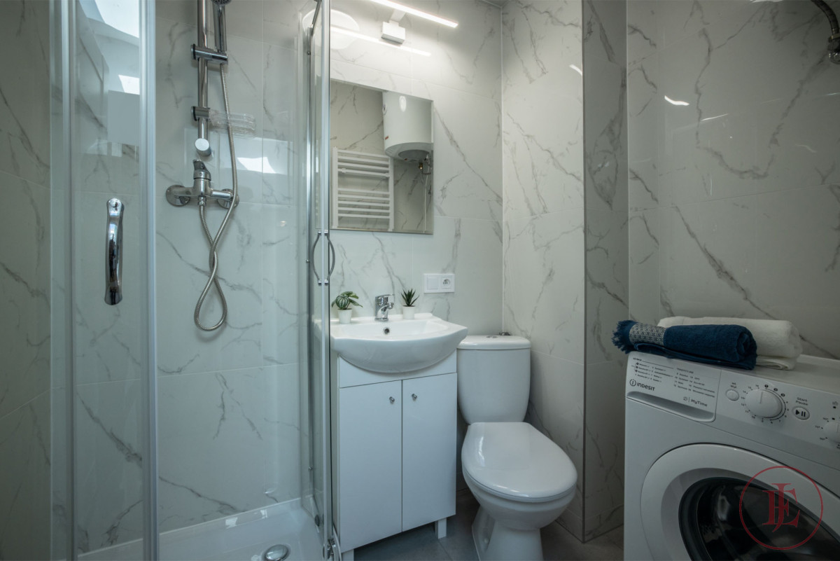 - Bathroom: shower cabin, toilet, cabinets, mirror, washing machine,