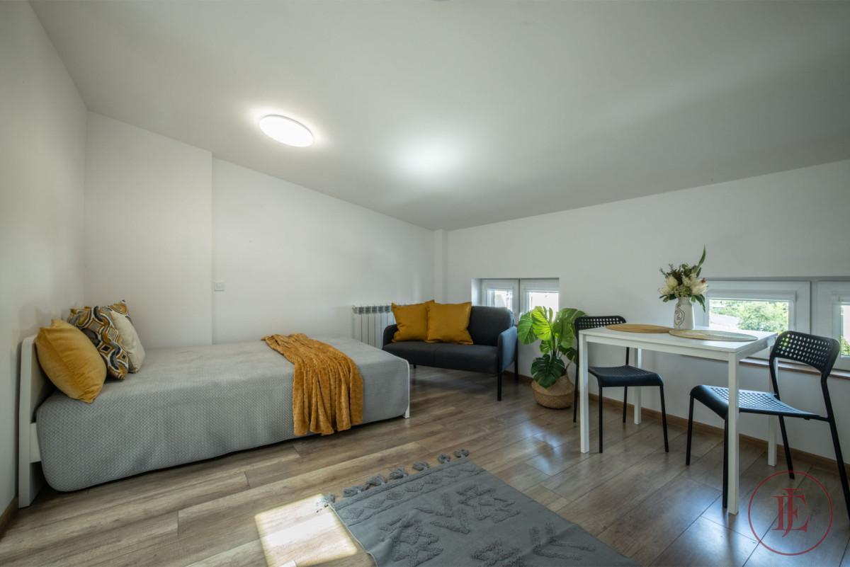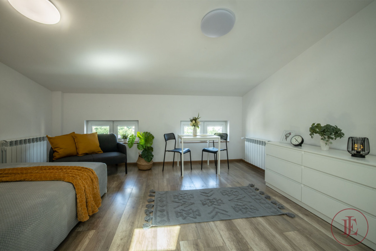 - Living room: sofa, bed (140×200 cm), wardrobe, chest of drawers, table with 2 chairs, shoe cabinet, large mirror,