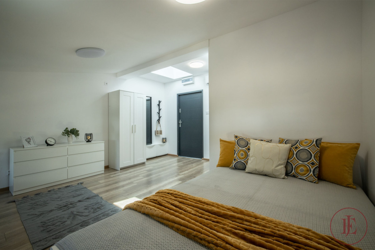 - w salonie: kanapa, łóżko (140×200 cm), szafa, komoda, stół z 2 krzesłami, szafka na buty, duże lustro,