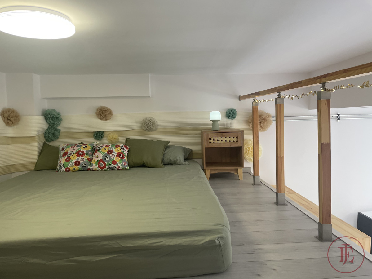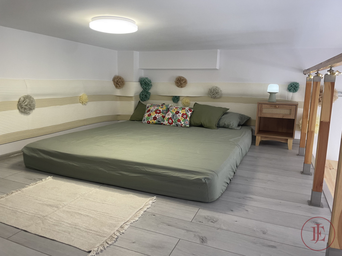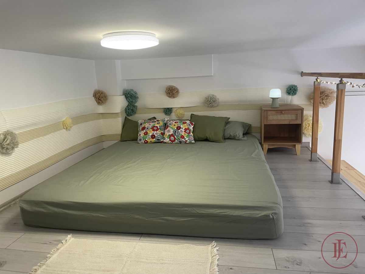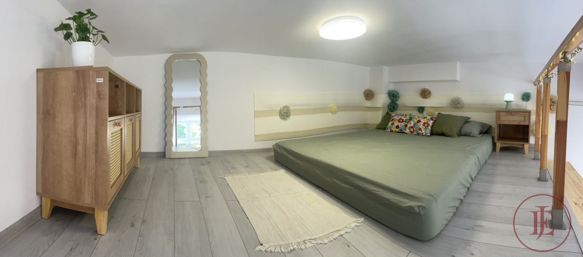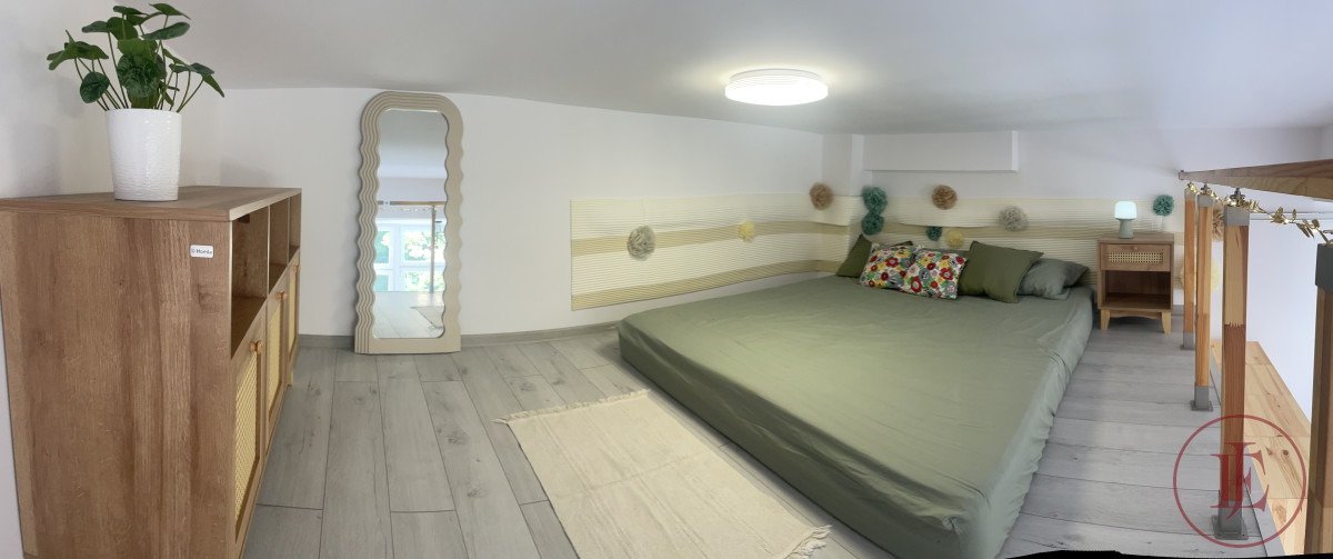 - Mezzanine: double bed 160×200 cm, mirror, spacious chest of drawers and a bedside cabinet.