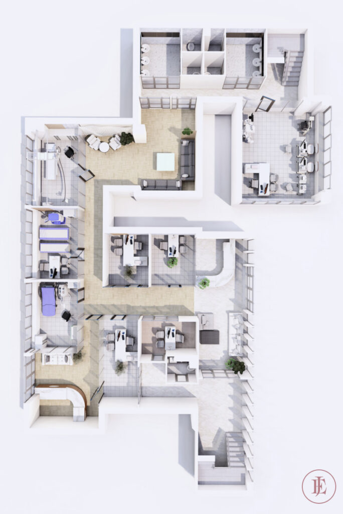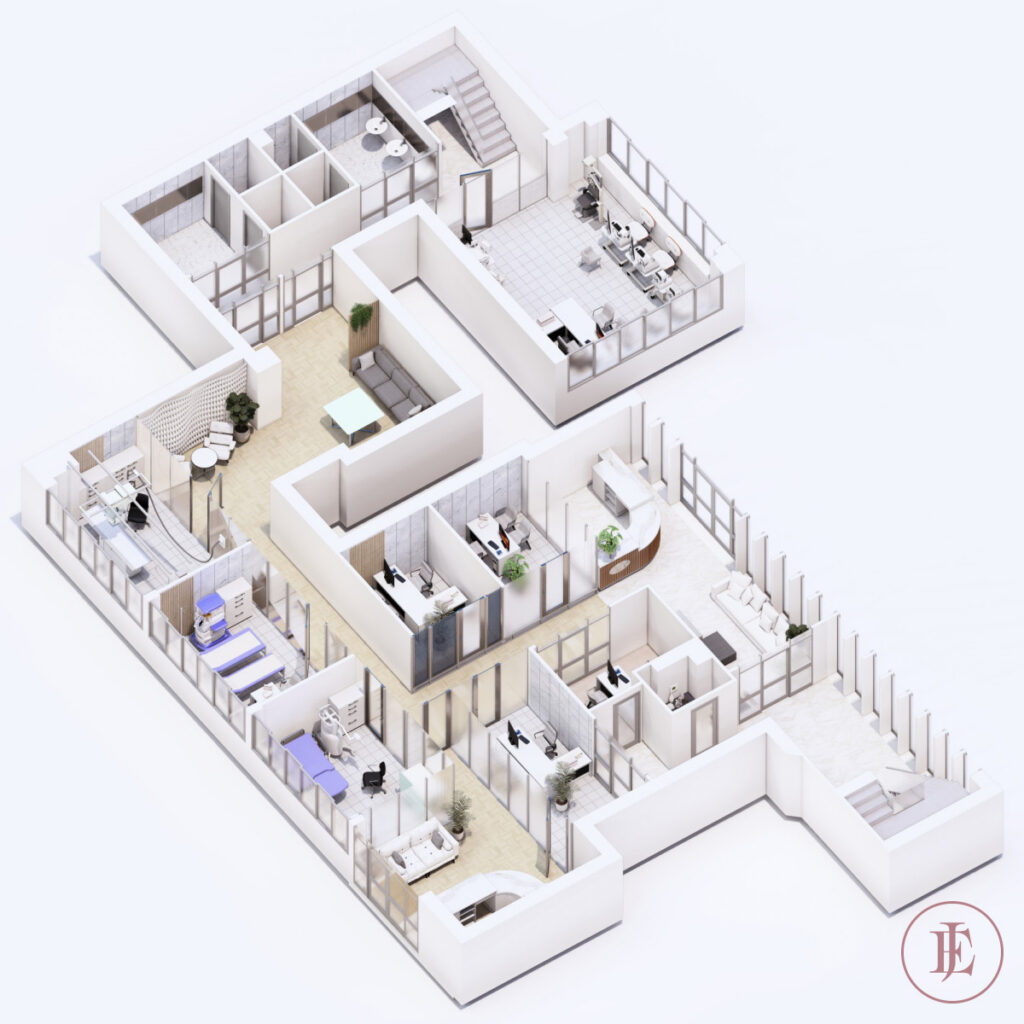 Wizualizacje pokazują potencjał pod klinikę medyczną, jednak przestrzeń daje bardzo szerokie możliwości adaptacyjne.