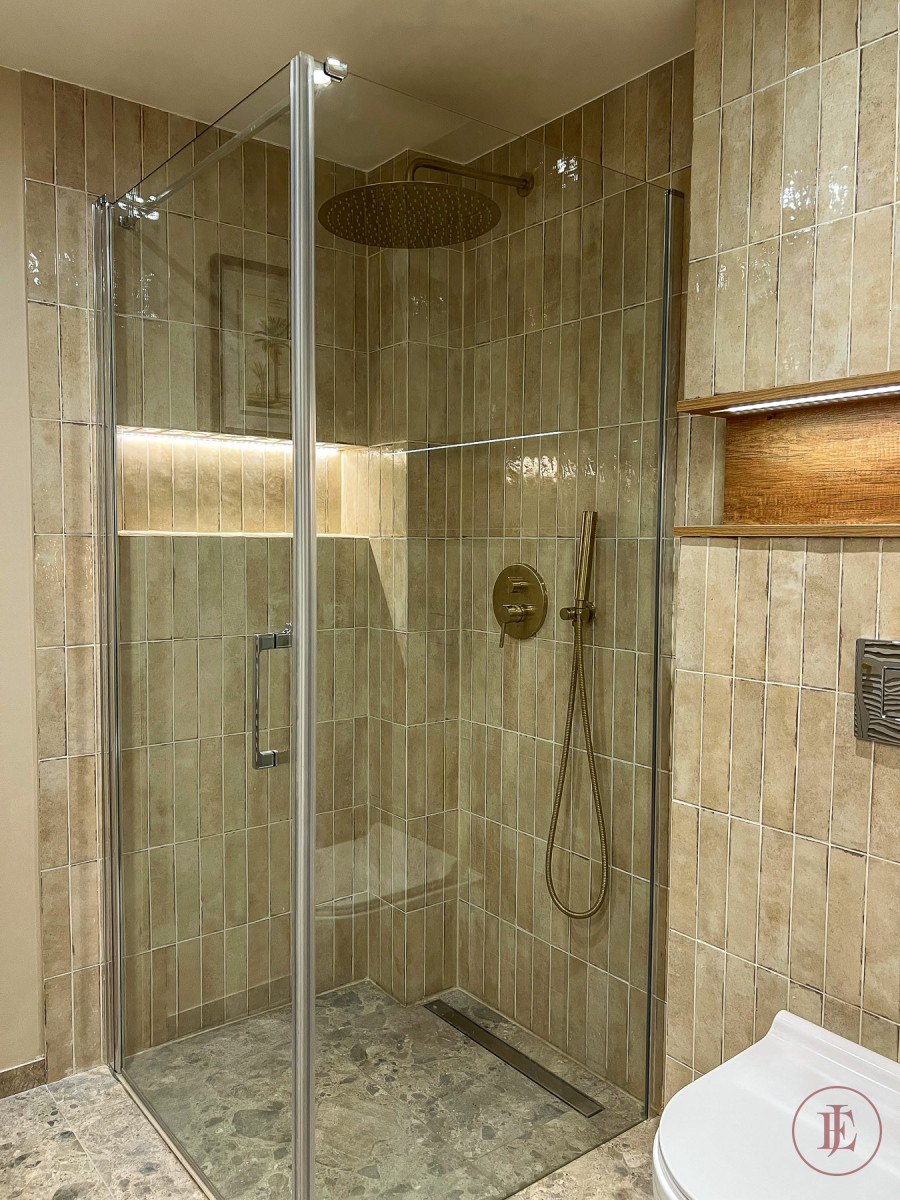 - nowoczesne łazienki: kabina prysznicowa, toaleta, szafka