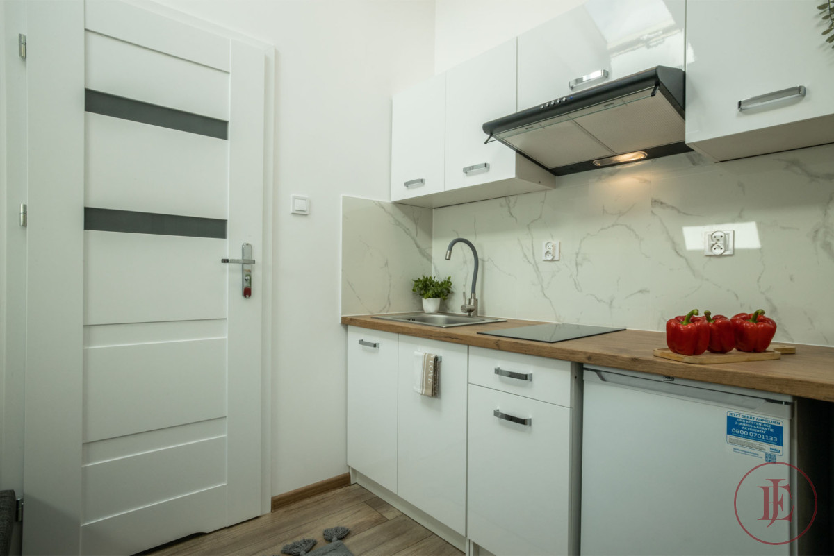 Mieszkanie zostało profesjonalnie podzielone na dwie, w pełni wyposażone kawalerki (ok. 17 m² i ok.20 m²) i korytarz między nimi. Każda z nich posiada osobne wejście, łazienkę oraz aneks kuchenny, dzięki czemu stanowią dwa w pełni wyposażone lokale mieszkalne.