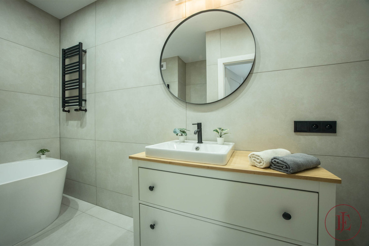 Apartament wykończony jest w nowoczesnym minimalistycznym stylu.