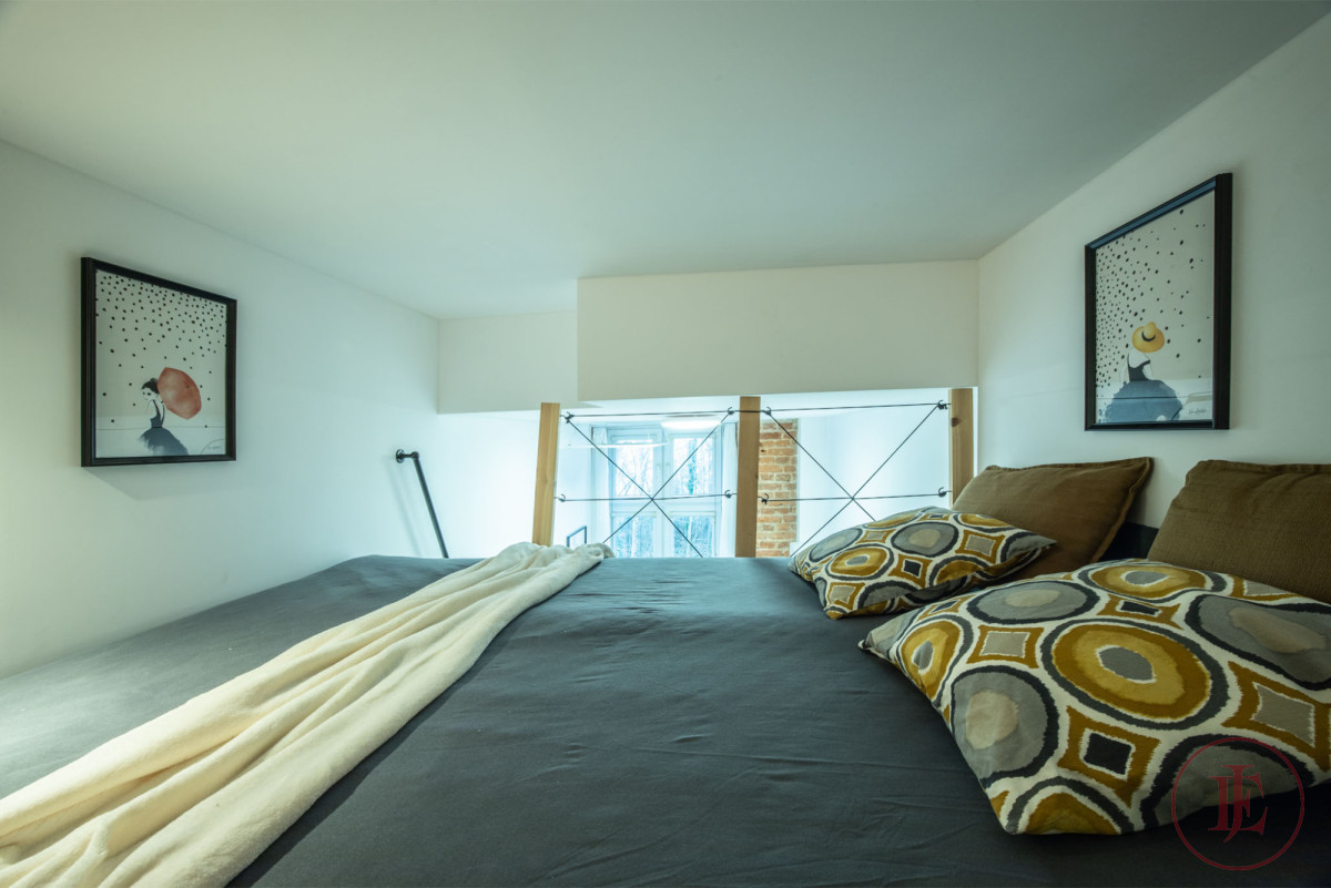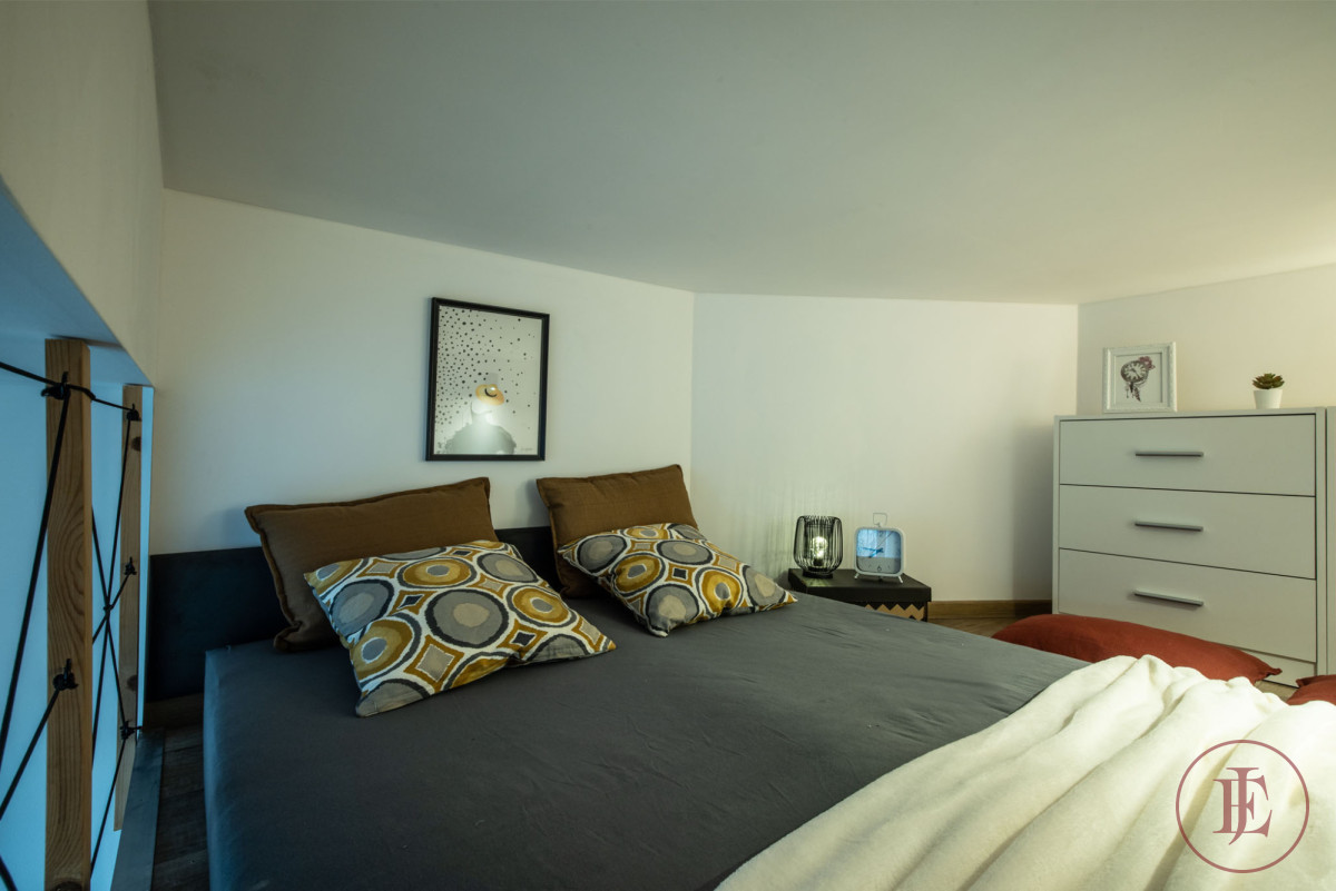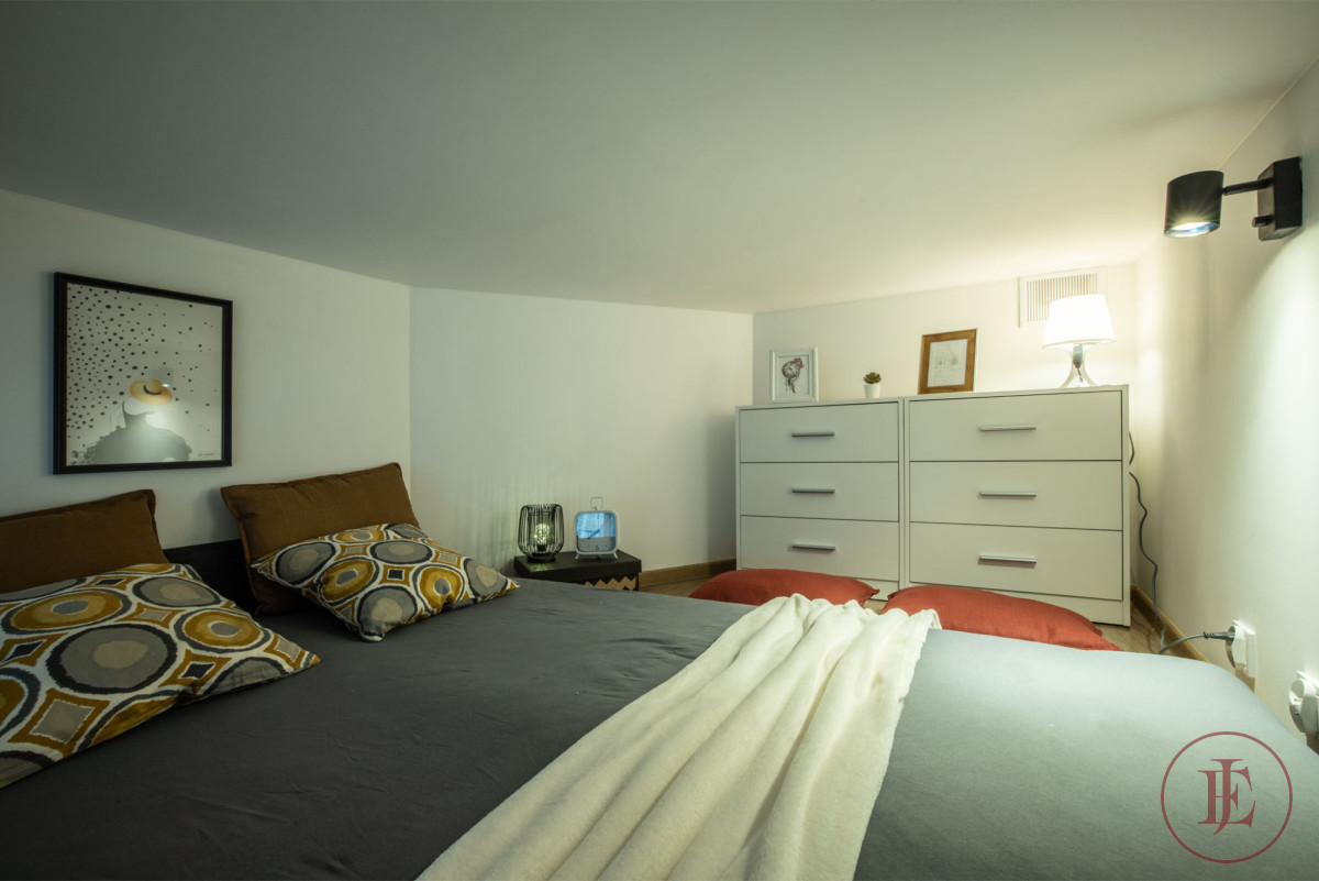 - Mezzanine: 140x200 cm bed and two chests of drawers.