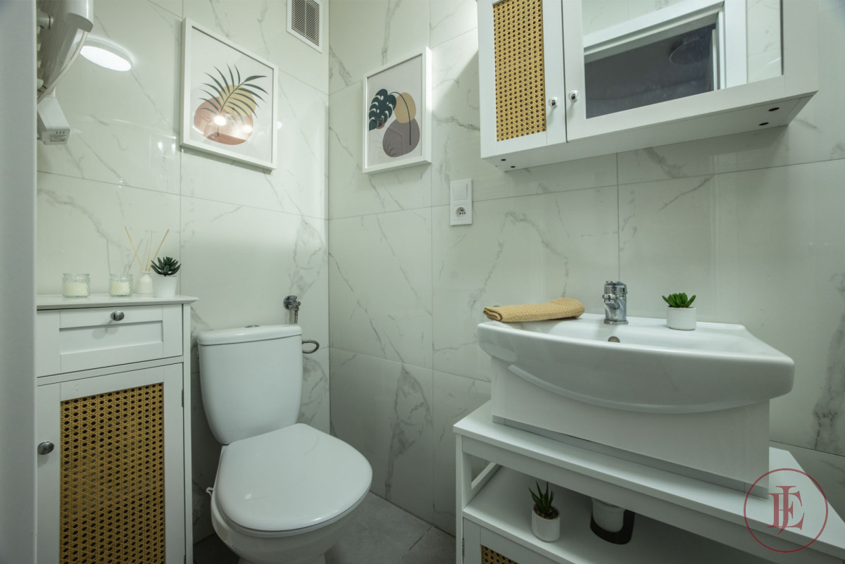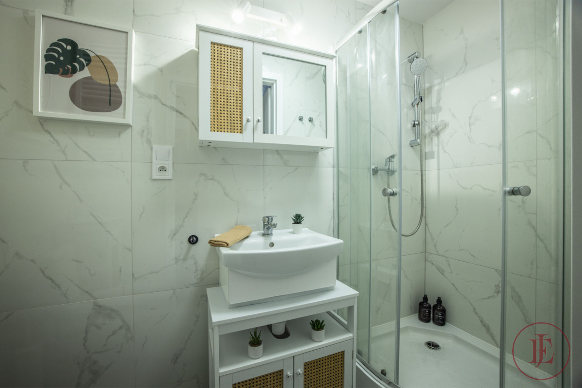- Łazienka: wykończona płytkami, posiada kabinę prysznicową, toaletę oraz trzy stylowe szafki, które zapewniają dużo miejsca do przechowywania.