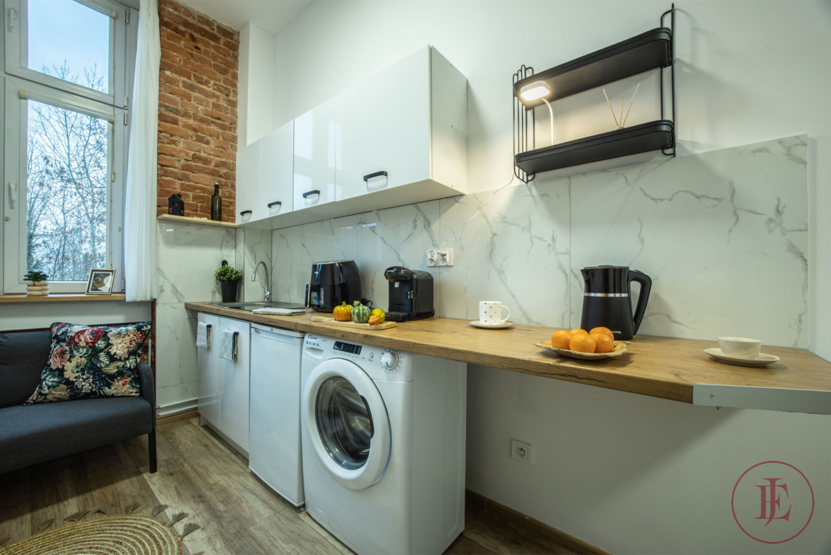 - Aneks kuchenny: szafki, zlew, sprzęt AGD: lodówka, pralka, płyta elektryczna, czajnik elektryczny, frytkownica wielofunkcyjna, a także pełen zestaw naczyń i sztućców.