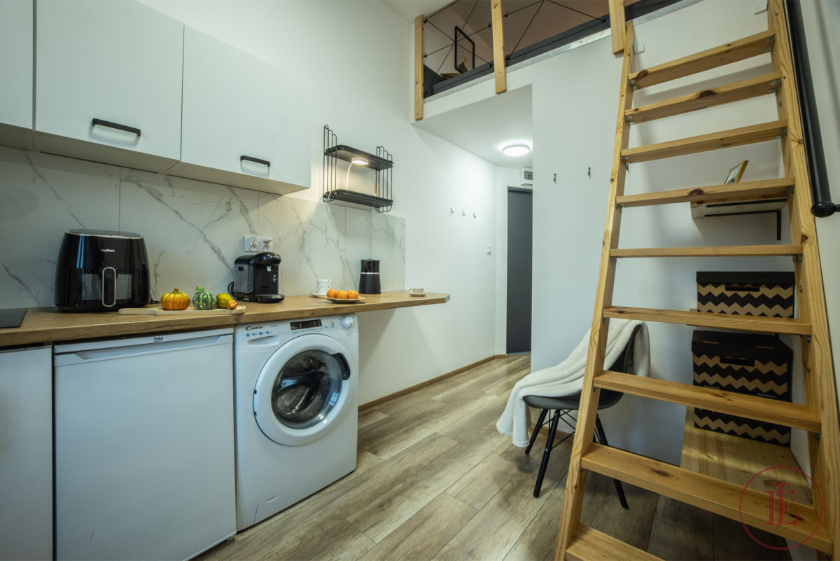 The apartment is located on the 2nd floor and consists of a living room with a kitchenette, a hallway, a bathroom (12.9 m²), and a mezzanine bedroom (4.5 m²). Finished in a modern style with wooden elements, it adds warmth and elegance to the interior.